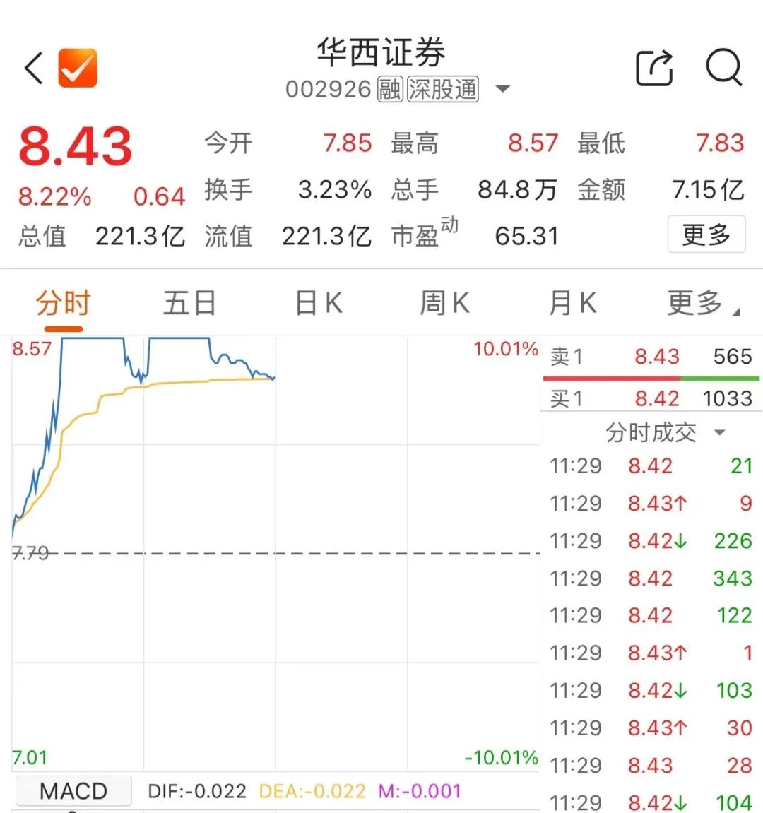 大金融板块同样震荡走强,华西证券盘中触及涨停。截至午间收盘,中航产融涨停,华西证券涨超8%,中粮资本、五矿资本、海通证券、招商证券等涨幅居前。