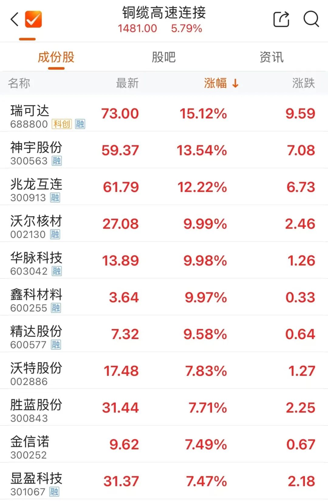 今日早盘,铜缆高速连接概念股表现活跃,华脉科技竞价涨停。截至午间收盘,瑞可达、神宇股份、兆龙互连涨超10%,沃尔核材、华脉科技、鑫科材料涨停。