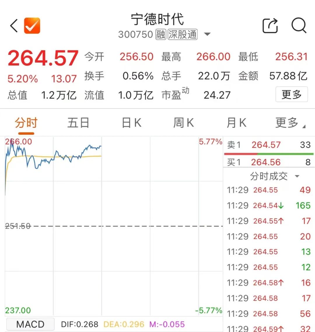 重点股方面,宁德时代早盘上涨5.20%,截至午间收盘报264.57元/股,半日成交额57.88亿元。