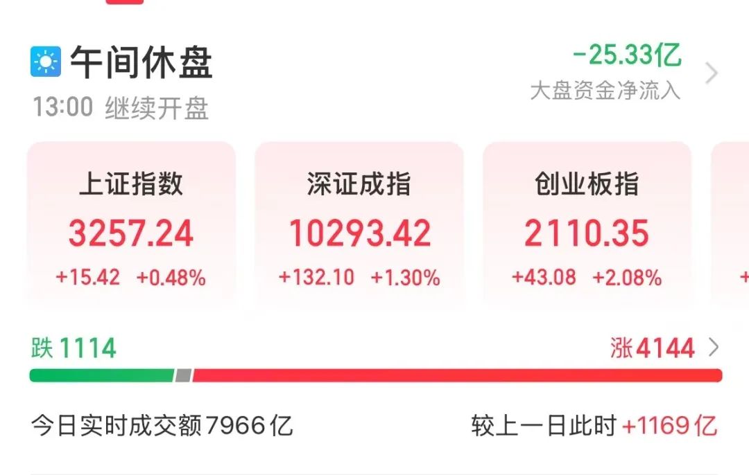周一早盘,A股三大指数集体走强,在宁德时代大涨超5%的带动下,创业板指涨势强劲。截至午间收盘,上证指数涨0.48%,深证成指涨1.30%,创业板指涨2.08%。A股市场半日成交额7966亿元,较上个交易日同期放量1169亿元。